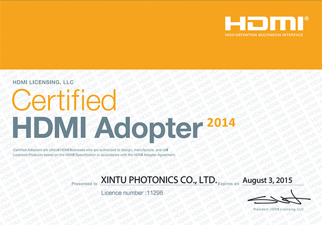 In August 2014, Xintu Photonics Co.,Ltd awarded the HDMI (High Definition Multimedia Interface) International Certificate?of?Authorization issued by HDMI associate.
