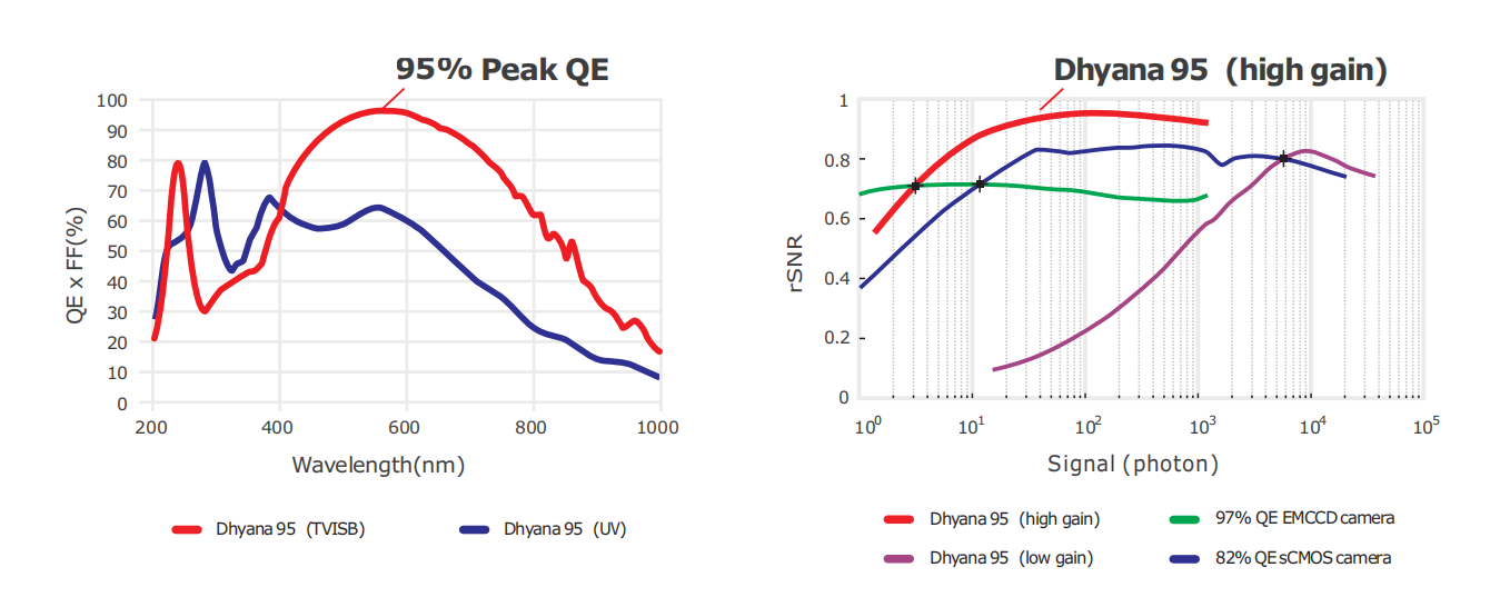 The Dhyana95 V2 uses backside-illuminated sCMOS thinned chip technology to avoid light interference from the wiring layer. It has excellent response capabilities in the ultraviolet, visible and near-infrared bands, with a peak quantum efficiency of up to 95%@560nm, and when the number of incident photons are more than 3 , it can have a better SNR performance than the typical EMCCD camera of 97% peak QE .