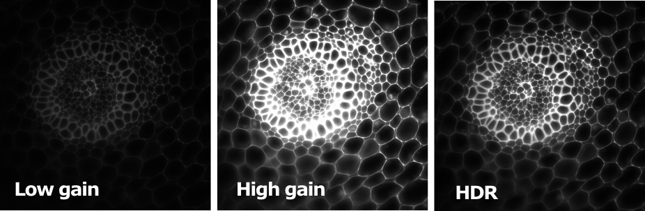 Thanks to the 11um large pixel , Dhyana95 V2's full-well capacity can be up to 100,000 electrons. Advanced High Dynamic (HDR) mode, through dual-channel gain conbined, it can present high-quality images with rich details of dark and bright in real time, which is very useful in applications such as life science.